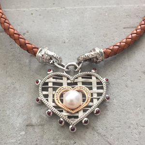 Brown leather cord with sterling silver, Santayana Signature connections clasps, that open in the center to allow you to switch out pendants.
