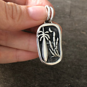 Rectangular pendant with a Cuban palm tree, sugar cane, and a hopeful crescent moon.