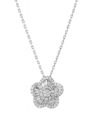 14K gold baguette and round diamond earrings available in white or yellow gold.
