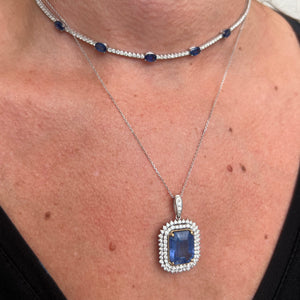 14K white gold pendant necklace with 9.83 carat sapphire center and 1.09 carat total weight in diamonds. This piece is the only one of its kind and will not repeat.