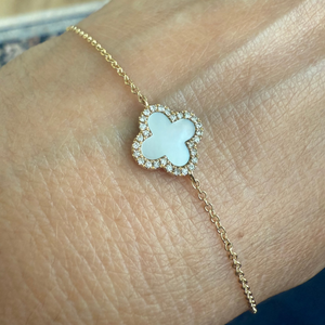Crafted in 14k yellow gold, this bracelet features a delicate clover shape in natural mother of pearl, framed by a halo of shimmering diamonds. It’s feminine, timeless, and designed to feel like a second skin.