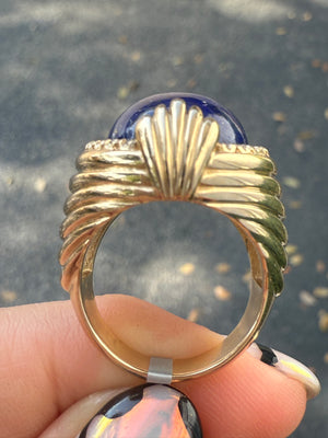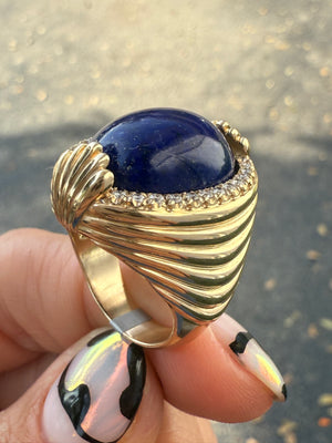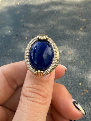 Featuring a rich lapis lazuli center framed in .40 carats of brilliant diamonds, this ring is finished with top and bottom accents that evoke the bold geometry of Art Deco architecture—just like the iconic buildings lining the streets of Miami.