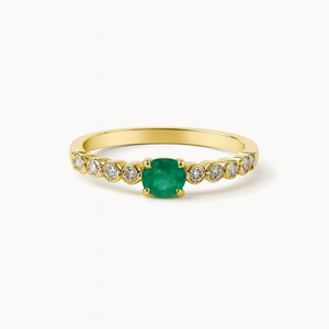A delicate emerald and diamond ring crafted in 14K yellow gold, featuring a 0.28 ct emerald accented by 0.16 ct of diamonds. Sweet and timeless, this slim band is perfect for stacking, everyday wear, or gifting