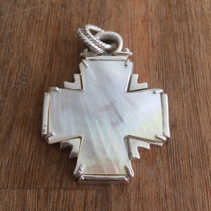 Sterling silver cross with hand-cut mother of pearl inlay.