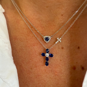 This sapphire cross brings together rich blue stones with a brilliant diamond center, creating a look that’s both bold and classic. It’s the kind of piece that feels like family history and future heirloom all at once.
