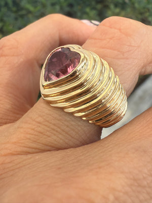 A bold 2.77 carat heart-shaped pink tourmaline sits front and center in 14K yellow gold, framed by our signature 1990 textured band. It’s sweet, strong, and unapologetically extra—just like the jewelry we grew up loving.