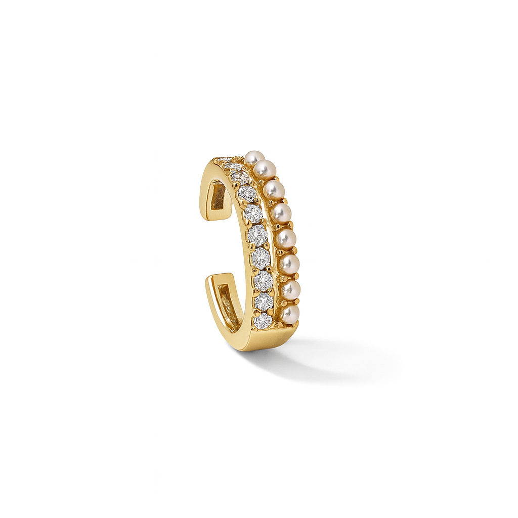 Yellow gold, pearl  and diamond ear cuff. Sold individually, includes one ear cuff.