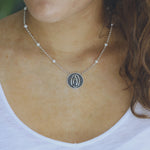 Sterling silver Virgen de Guadalupe pendant on silver with fresh water pearls necklace. This coin size is roughly the size of a quarter.