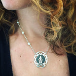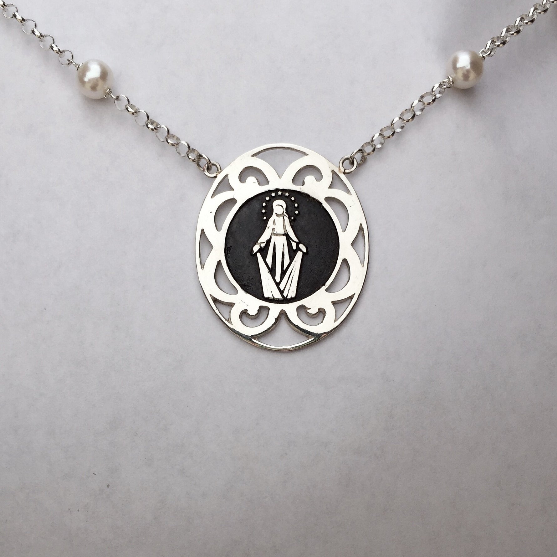 Sterling silver and freshwater pearl necklace featuring Santayana original Milagrosa design medal.