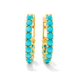 A fresh pop of color meets timeless gold. These 14K yellow gold hoop earrings are set with vibrant turquoise cabochons all the way around—offering a striking profile from every angle. The slim 3mm width keeps the silhouette refined, while the 24mm height adds just the right amount of presence on the ear.